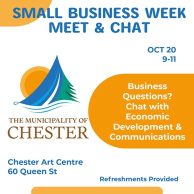Do you have questions about starting or growing a business in our Municipality of Chester? On October 20 during Small Business Week, come chat with our Economic Development Officer and Communications Officer at the Chester Art Centre. Bring your questions about promoting your business, when do you need a permit, growth plans, etc…Drop in anytime between 9am-11am. Refreshments Provided.